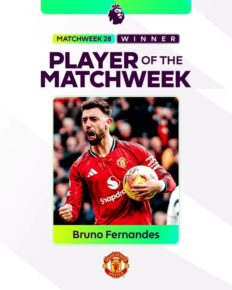 虎扑03月03日讯 英超官方宣布,经过球迷的投票,曼联队长B费当选本轮英超最佳球员,这也是这位葡萄牙国脚本赛季第四次获得这一奖项。
